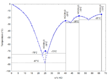 如下圖所示,鹽酸共有四個結(jié)晶的共熔點,分別對應(yīng)四種晶體:68%(HCl的質(zhì)量分數(shù),下同)時的HCl·H2O、51%時的HCl·2H2O、41%時的HCl·3H2O和25%時的HCl·6H2O。另外在24.8%時還有一種亞穩(wěn)的HCl·3H2O生成。